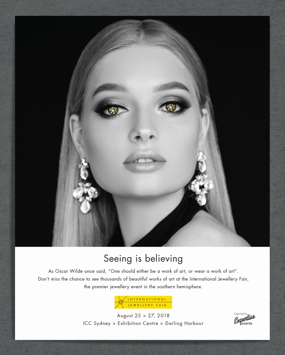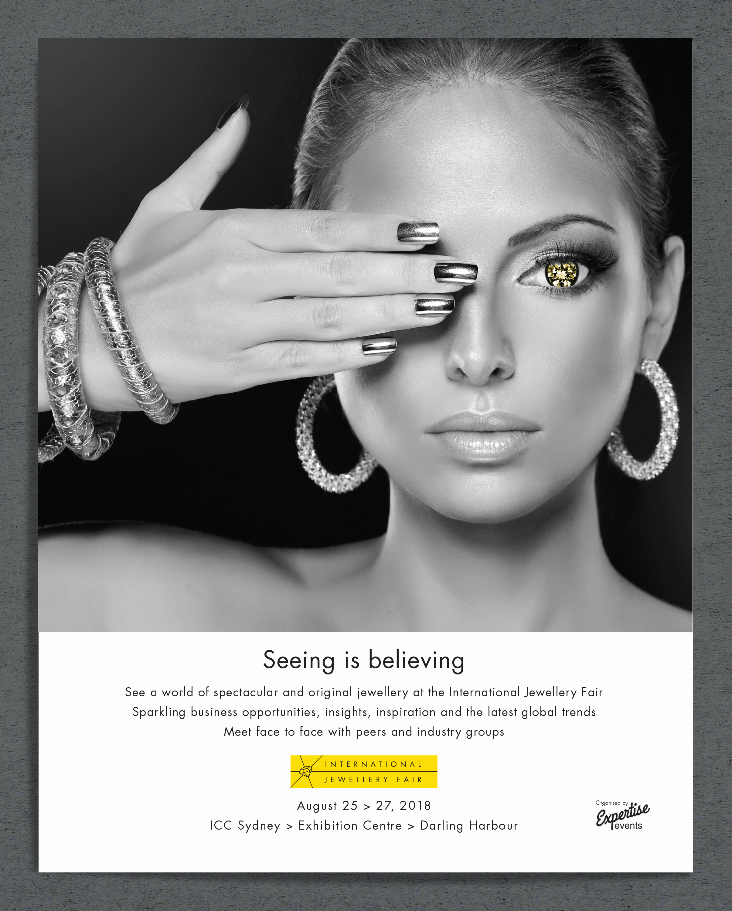 I achieved this by using strong black and white images of sophisticated women, and reinforcing the yellow logo with the yellow diamonds in the subjects eyes. ‘Seeing is believing’ was the tagline, the key message being that you have to be at the show to fully experience it, and that whether a visitor or an exhibitor, you need to be there. I worked on this campaign and designed the key visual using the yellow diamonds in the eyes of the subjects.
