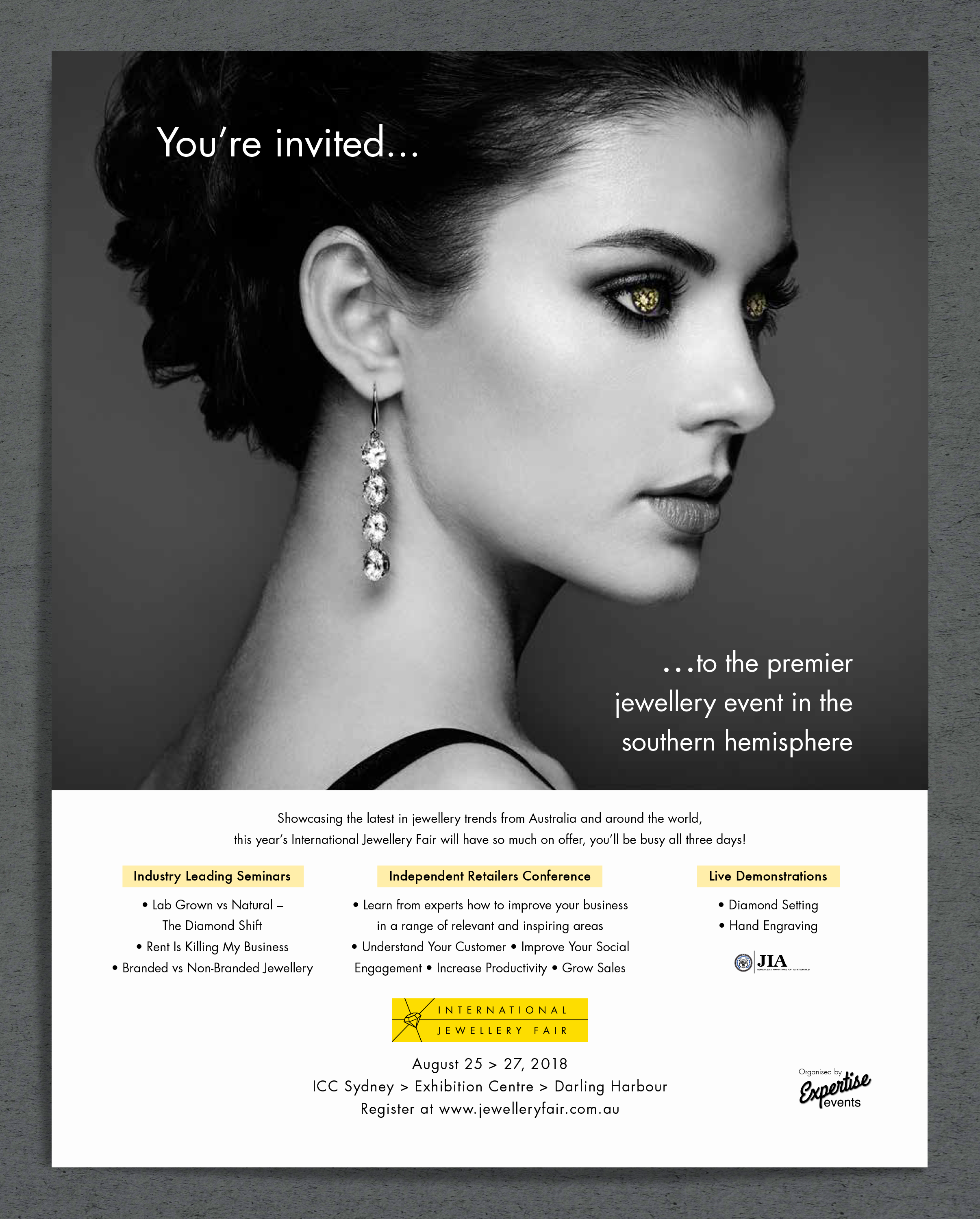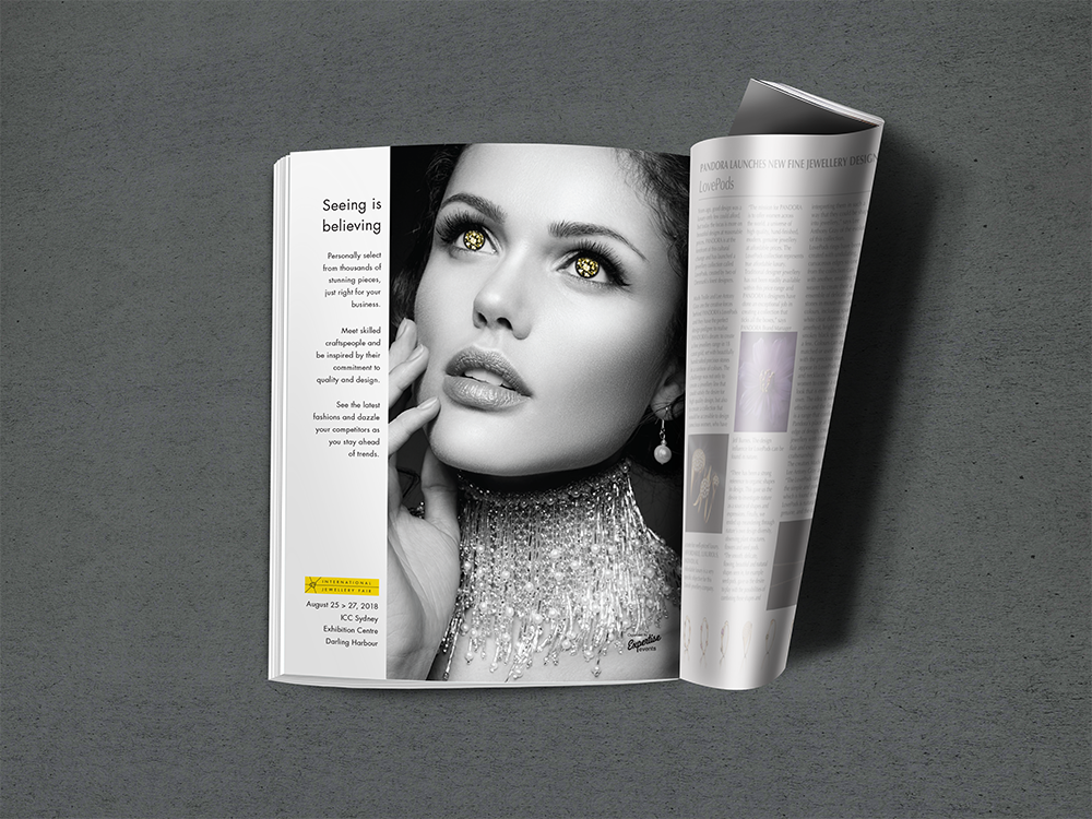 Each of these were full page ads in the trade magazine Jeweller, the above mockups showing how they appeared in the magazine. The campaign gained good brand recognition over the months leading to the event. The images were also used on the website to promote the 2018 event, and on the signage at the event. In the final month of the ad campaign the reader is reminded of the conferences, seminars and demonstrations they can see at fair (see bottom of page).