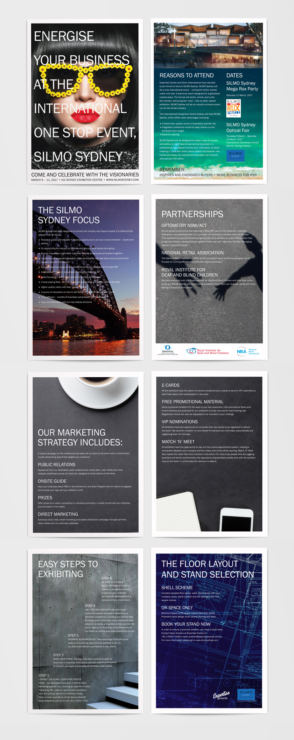 I designed this sales brochure for Silmo Sydney, a new trade event at ICC Sydney. This was a new show for the optical industry, covering technology, fashion, and all things related to eyewear. The brochure was sent to potential exhibitors via email, with a few digitally printed copies as handouts.