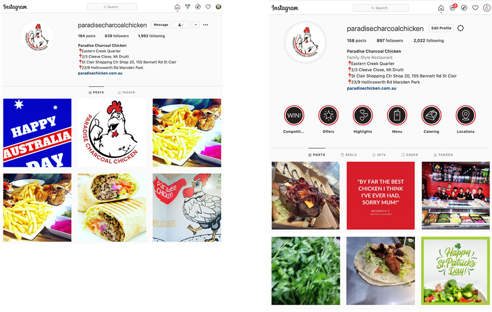 I planned and executed a social media campaign for Paradise Charcoal Chicken. The strategy was to introduce a wider variety of content to entertain, engage and inform audiences of acitivities at the chain of restaurants. I added their menu, locations, and other highlights to engage audiences and help grow their social media following. This helped to build trust, increase engagement and loyalty to the brand, whilst also driving traffic to the restaurants.
